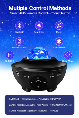 استمتع بمزيج مذهل من نجوم المجرة ، وسحب السديم ، وأمواج المحيط التي تملأ غرفتك بأضواء متحركة وملونة لتجربة هادئة وساحرة.